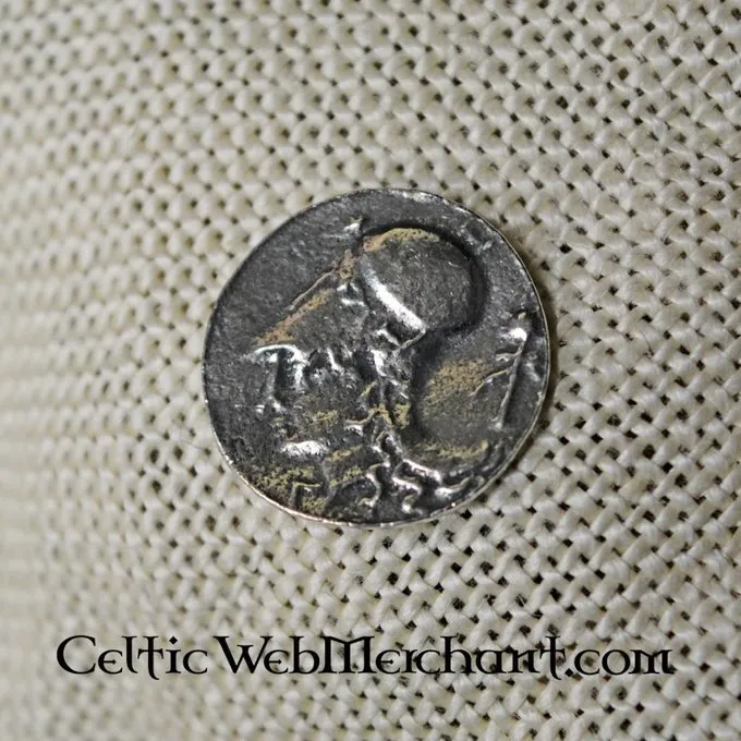 Diese alte griechische Münze (drachme) ist eine Replik von mehreren Originalen aus dem 6. Jahrhundert. Die Münze wurde in dem griechischen Stadtstaat Athen geprägt. Die ersten Münzen hauptsächlich Tiere dargestellt, die mehrere Stadtstaaten vertreten. Diese Münze hat eine pegasus auf der einen Seite, ein geflügeltes Pferd aus der griechischen Mythologie. Die andere Seite zeigt einen Krieger mit einem korinthischen Helm schob halb über den Kopf.