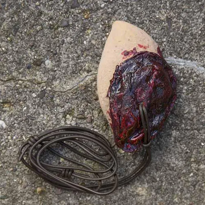 Material: 100% Latex, katoen / / Länge: 5,5 cm / / Breite: 2 cm / / Höhe: 8,5 cm / / Farbe: Hautfarbe mit Blutflecken / / Länge Riemen: 120 cm /