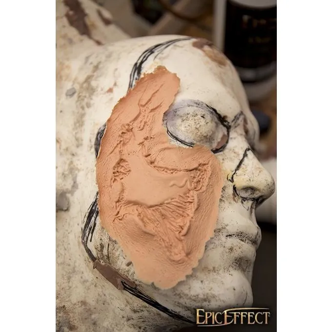 Sie können diese hochwertige Latexprothese auf Ihrem Gesicht mit Zahnheilkleber oder Mastix Spirit GUM kleben. Damit machen Sie ein Zombie-Gesicht mit einem zerrissenen Wangenbein. Sie können es wiederverwenden. Perfekt für Halloween und Larp mit Zombie-Charakteren. Mit dem epischen Waffenkammer-Make-up können Sie es in einer anderen Farbe malen.
