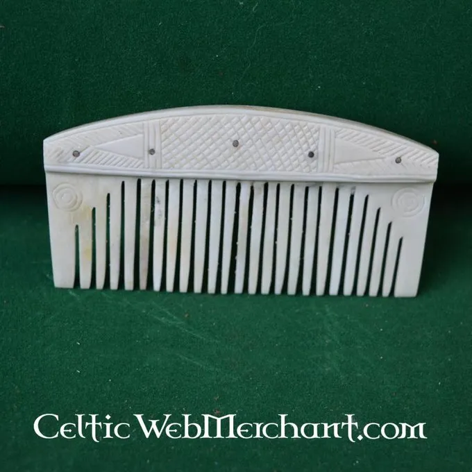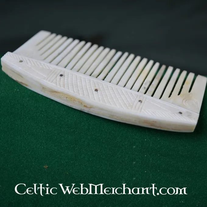 Dies ist eine Nachbildung eines frühmittelalterlichen Knochenkammes, wie zum Beispiel der Wikinger, Sachsen und Slawen verwendet. Auf der Rückseite wird mit einer zweiten Schicht aus Knochen gestärkt. Der Kamm misst 10,5 x 5,5 cm.